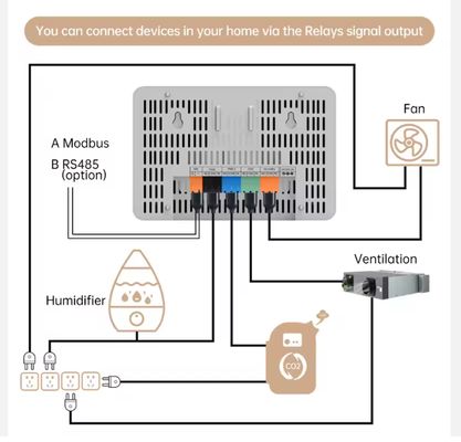 | Câblage de sortie unique | RS485/Relais pour la sortie du signal CO2TVOC, PM2.5 et humidité |